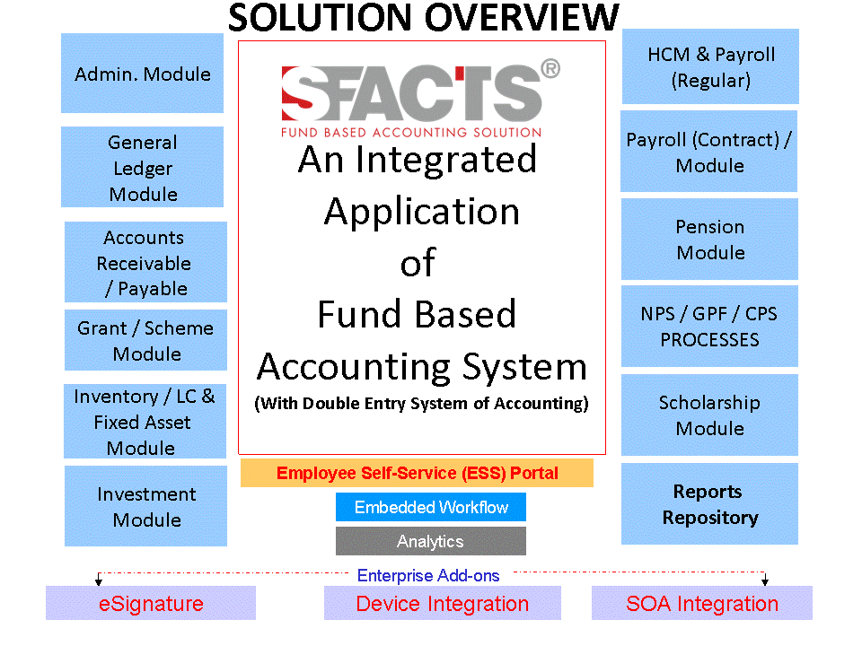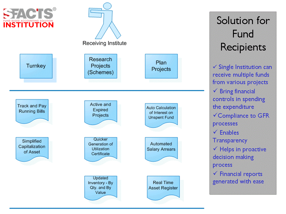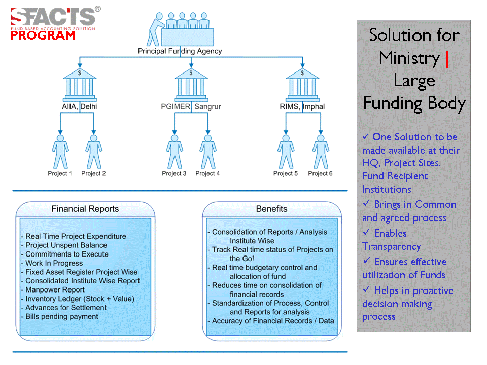 SFACTS - GRANT ERP which is a Proprietary software application (having received the IP Rights on our product) designed to meet the restricted and unrestricted grant accounting requirements. A fund based Accounting solution may be termed as a method of accounting which enables the Institution / Organization to track the expenses, commitment (Encumbrance/ Reserve/Obligation) and the balance against a specific grant/fund. The method of accounting not only enables to allocate the grant but also facilitate the double entry method or accrual method of accounting to derive various financial reports (Income & Expenditure, Balance Sheet, Schedules etc).