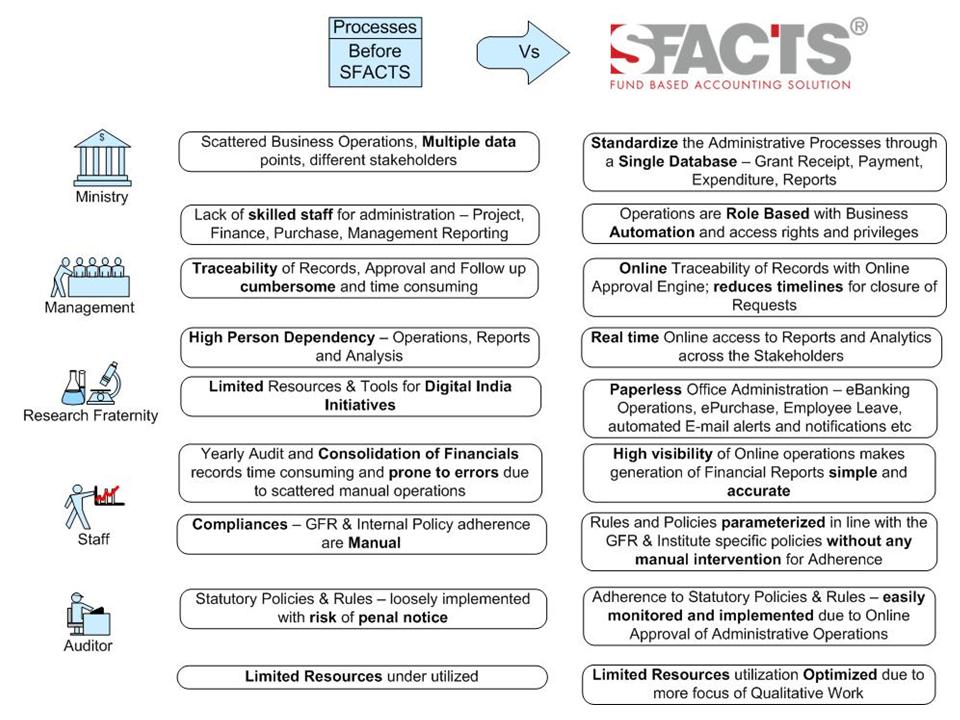 SFACTS is a fully integrated ERP system with rich features designed exclusively for managing the specific requirements of Research and Development Institutions. The comprehensive functionality of SFACTS has a unique implementation and support approach will deliver a superior value